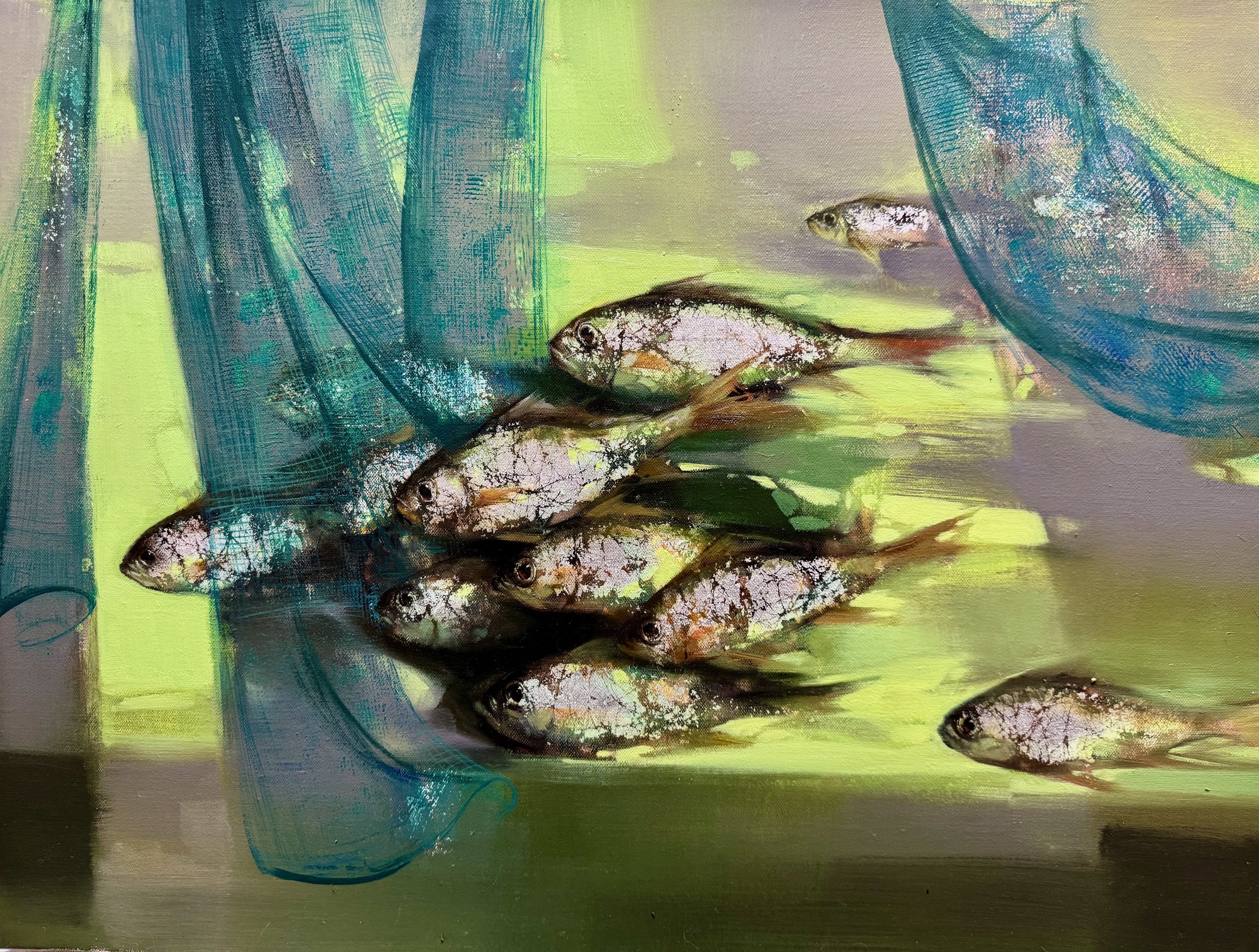Yanqun’s technique is richly expressive. He builds the net with heavy impasto, using palette knives to create thick, sculptural ridges and textured layers that evoke weathered rope and woven mesh. Fine cracks and built-up surfaces add tactile depth and a sense of age. The fish are rendered with luminous silver-white scales marked by deliberate craquelure, giving them a fragile, porcelain-like quality that contrasts with the vibrant, fluid background.