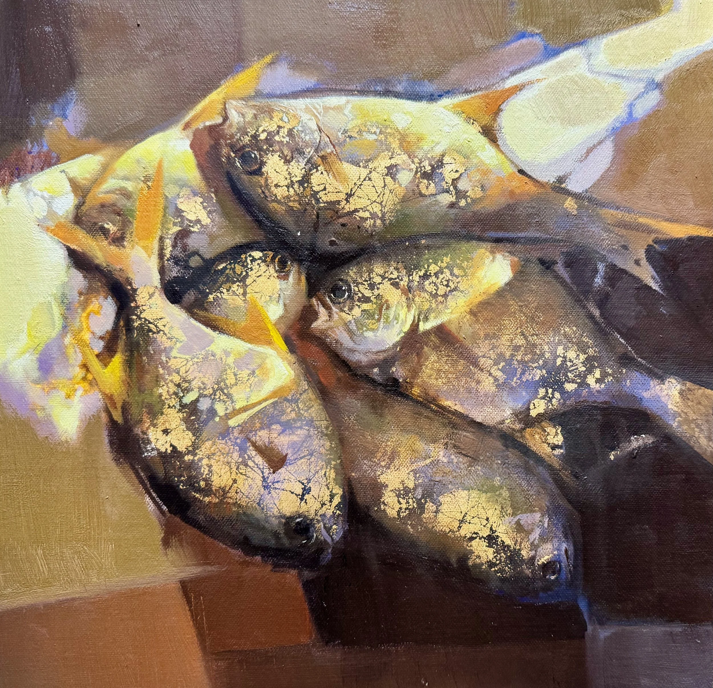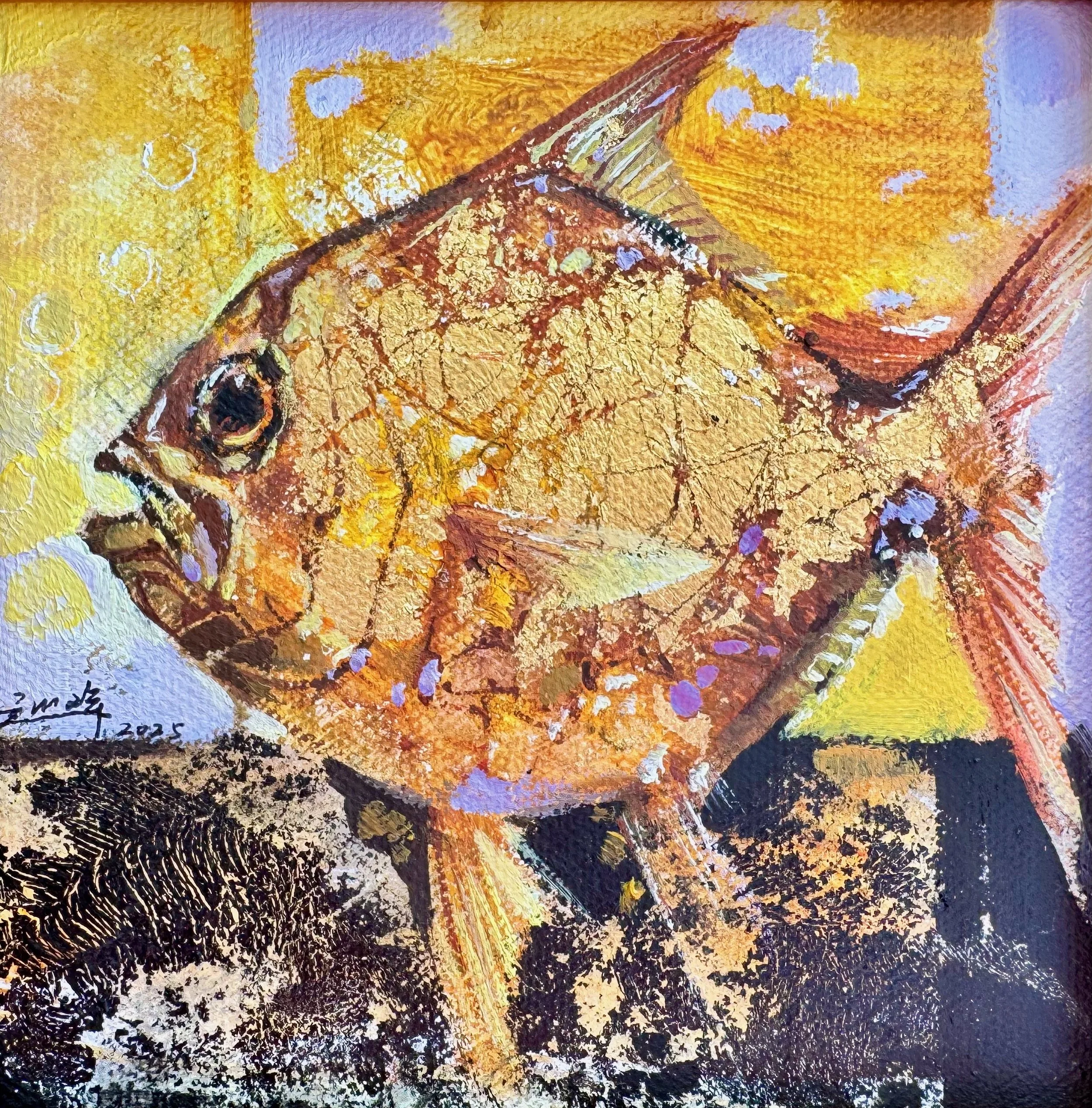 Technically, the works demonstrate virtuoso mixed-media skill. Each fish is rendered with expressive impasto and palette-knife strokes over rich orange, red, and brown underpainting. Golden leaf fragments and metallic flakes are physically embedded into the surface, selectively distressed, and partially overpainted to create authentic metallic shimmer and tactile three-dimensional relief. A delicate, web-like craquelure is intentionally induced through layered incompatible media that shrink and fissure during drying, lending the golden “skin” an ancient, cracked beauty while revealing flashes of underlying color.