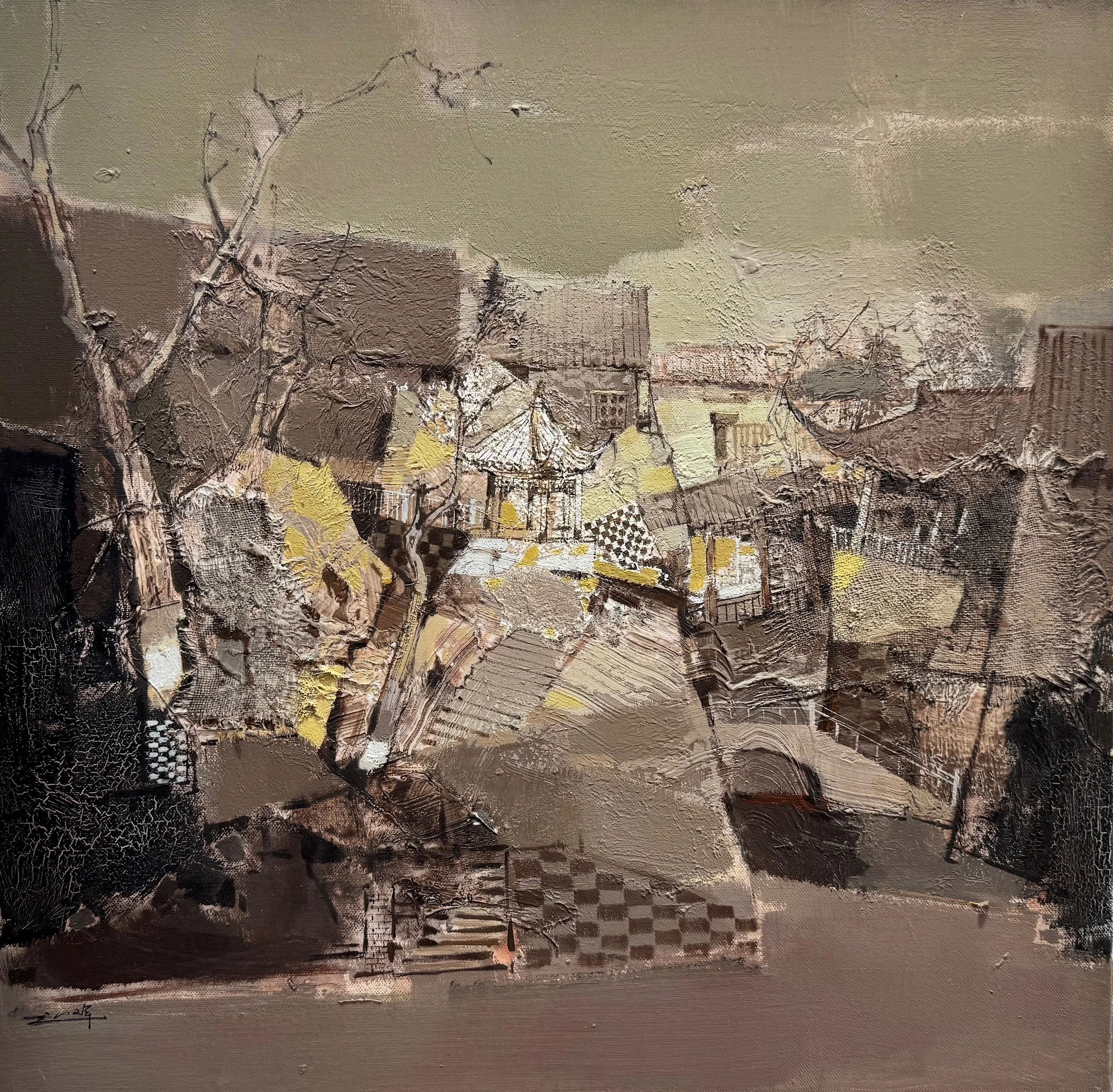 Layered excavation of place and identity. Executed in a rich, tactile mixed-media technique (heavy impasto, collage fragments, and what appears to be subtle gold leaf or ochre glazing), the surface itself becomes a metaphor for time’s erosion. The composition is anchored by a delicate central pagoda, its eaves still elegant yet partially obscured by overlapping planes of crumbling plaster and checkerboard remnants — those geometric motifs that once spoke of ordered domestic and ritual life now fractured and half-buried.