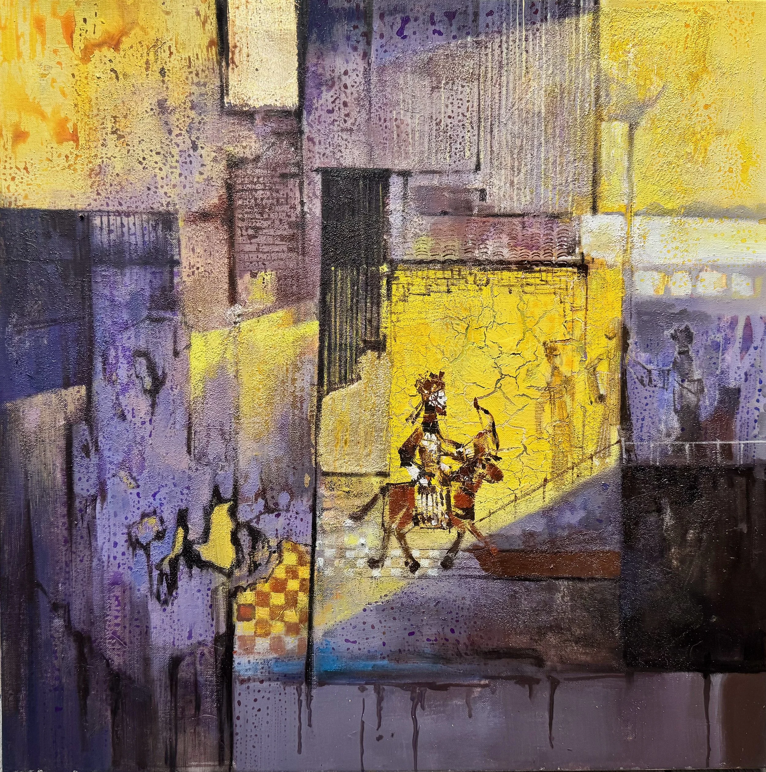 This is a richly textured, semi-abstract work that fuses figurative storytelling with urban fragmentation. At its glowing core, a mounted archer—clad in ornate traditional attire, bow in hand—rides a sturdy horse through a narrow, illuminated passage. The central yellow panel, deliberately cracked like an ancient fresco, isolates the rider in a dramatic spotlight, while the surrounding composition dissolves into geometric blocks suggesting weathered buildings, brickwork, a solitary streetlamp, and faint silhouetted figures on the right. A small checkerboard motif anchors the lower left, and vertical drips of deep purple and black cascade from the base, evoking rain or melting time.