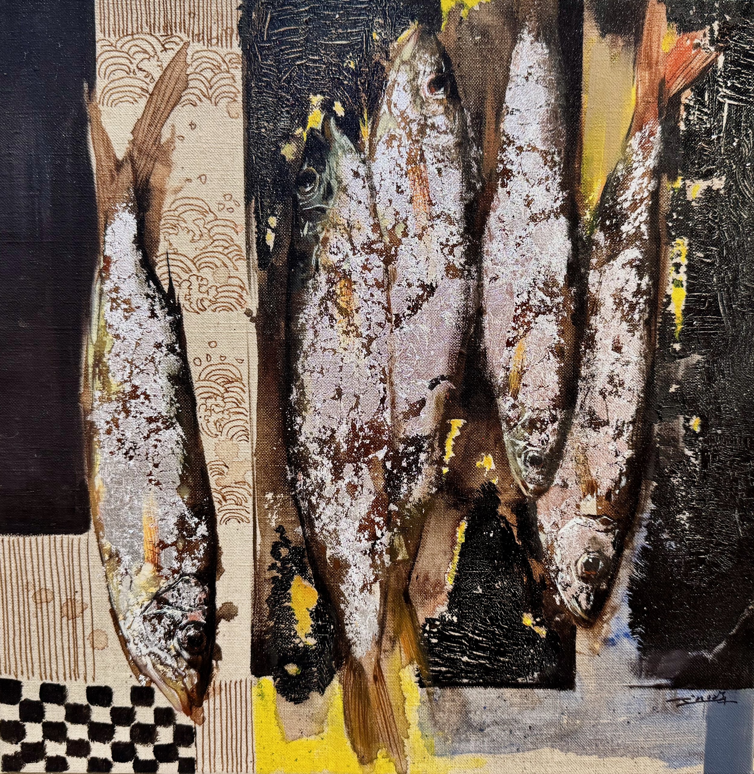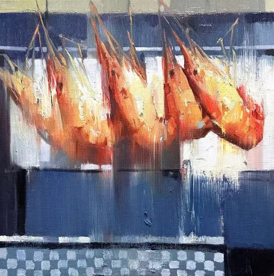 The backgrounds use strong geometric colour blocks and recurring checkered motifs to heighten contrast with the organic forms. Through this dynamic fusion of expressive impasto, directional drips, glazing, and mixed-media layering, Yanqun transforms everyday seafood into powerful meditations on abundance, fragility, and the urgent pulse of life.