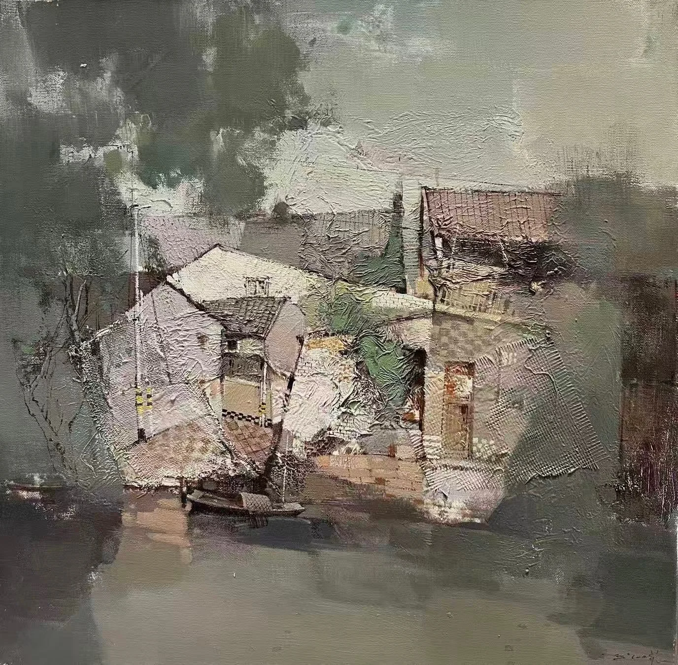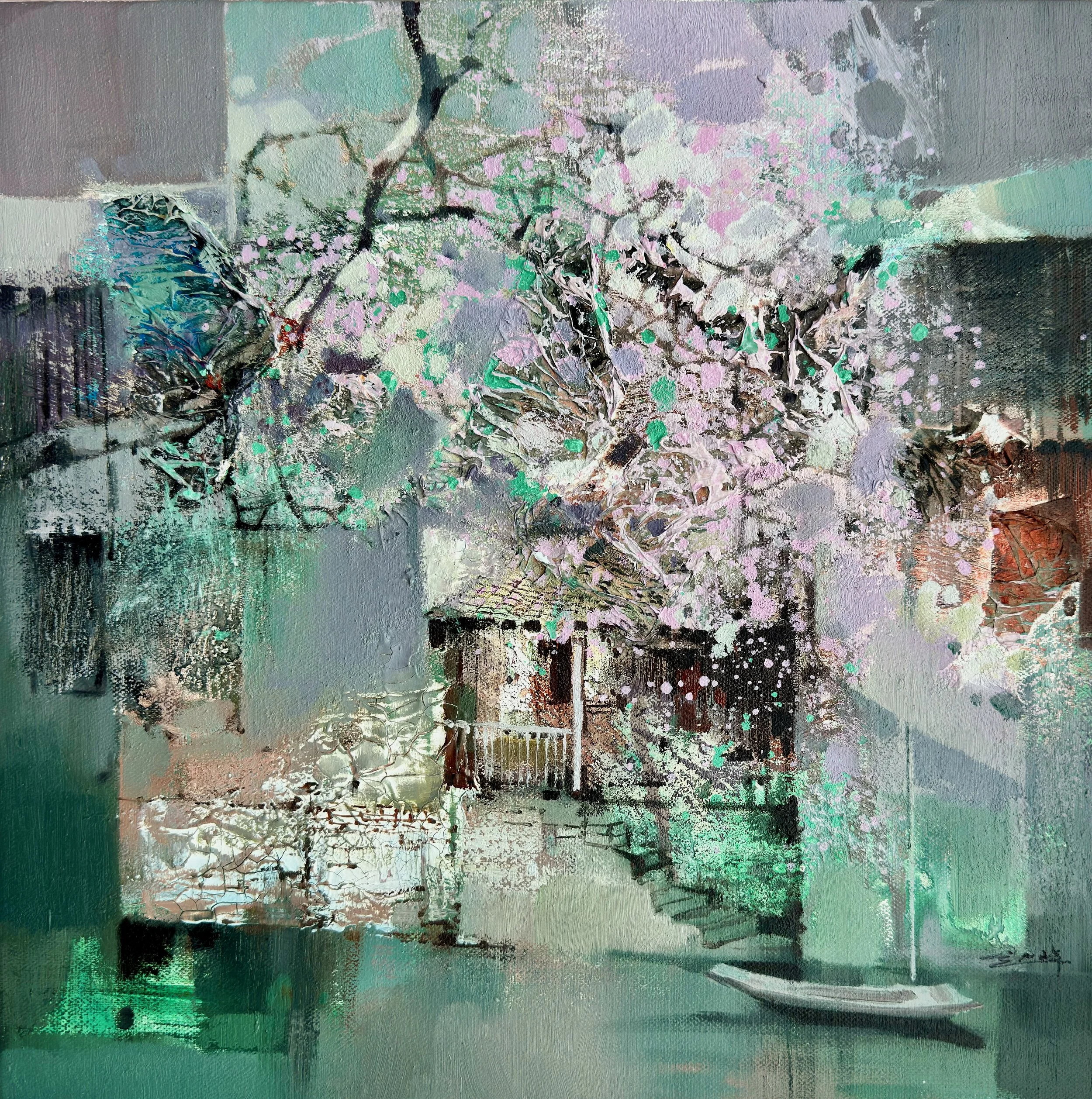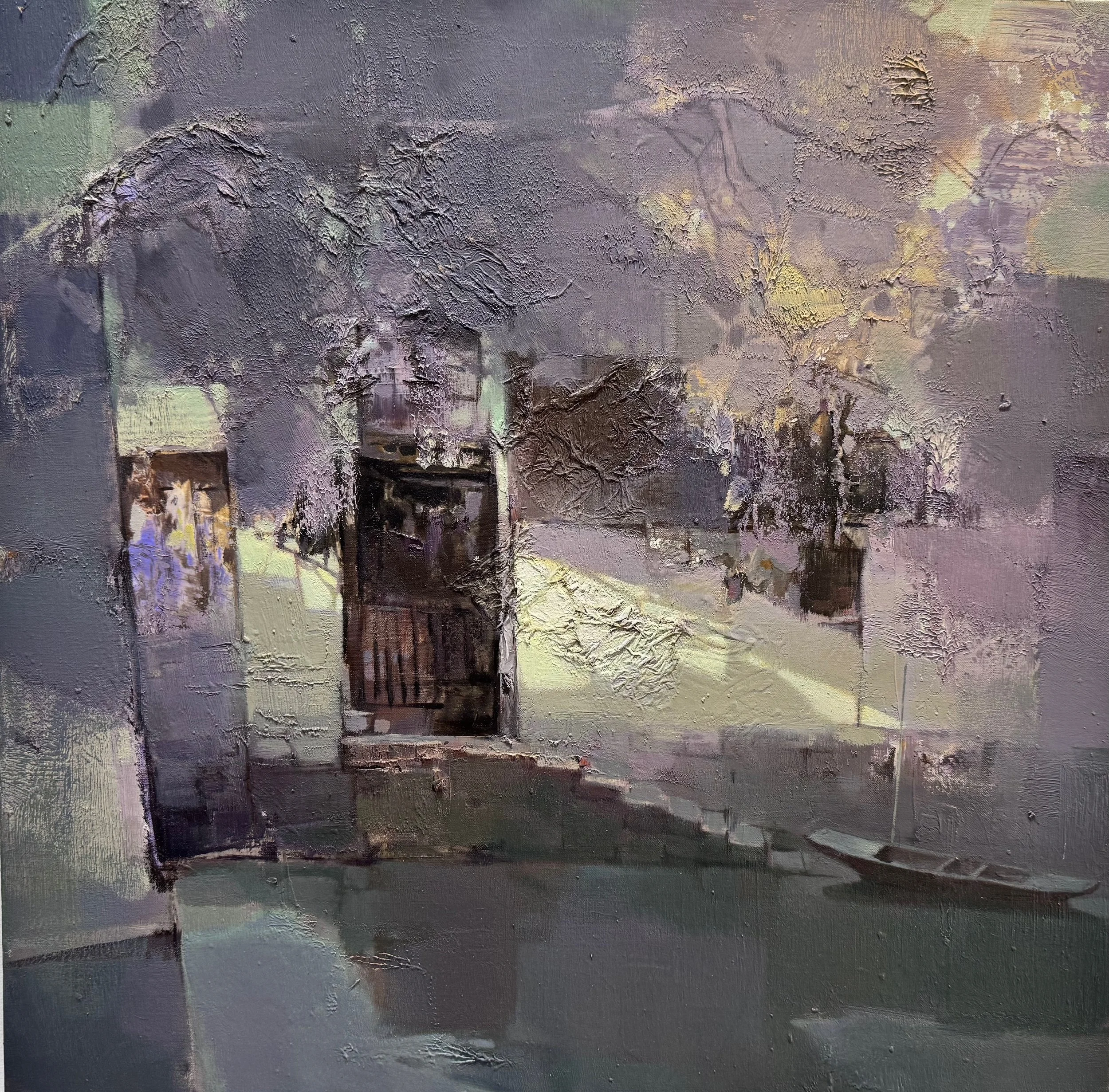 In this warm depiction of a waterside, the artist captures the quiet persistence of time through layered impasto and subdued light. A weathered arched doorway stands as a threshold between past and present, its surface textured with the patina of memory—faded grays, soft lavenders, and fleeting glints of warmth. The small boat, gently moored at the water’s edge, anchors the scene in stillness, evoking a sense of preserved recollection amid the transience of urban change. Through thick, tactile brushwork and a dreamlike haze, the work invites viewers to linger in the hush of forgotten lanes, where echoes of daily life remain suspended in reflective calm.