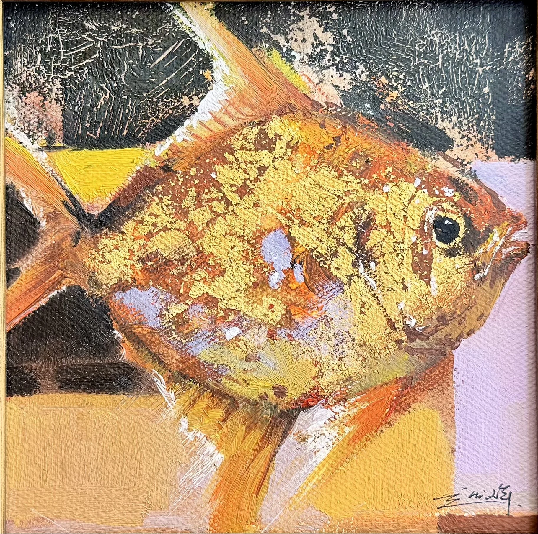 What distinguishes this intimate square work is Yanqun’s masterful hybrid technique, which fuses Western oil painting traditions with Eastern aesthetic sensibilities. The fish are built through heavy impasto, applied with palette knives to create pronounced three-dimensional relief. Thick ridges of paint and subtle drips give the bodies a sculptural, almost tactile quality, while translucent glazes over silver-white layers produce a luminous, metallic sheen that shifts with the light.
