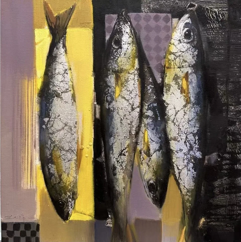 In The Fourfold Surplus, Yanqun presents four fish suspended in a richly textured, geometrically divided space. One fish hovers alone against a vibrant yellow vertical band, while three others cluster in the centre-right, their silver bodies gleaming with life-like presence. The composition draws on the Chinese cultural symbolism of yu (fish/surplus), evoking abundance, prosperity, and the quiet reflection of the soul — themes central to the artist’s practice.