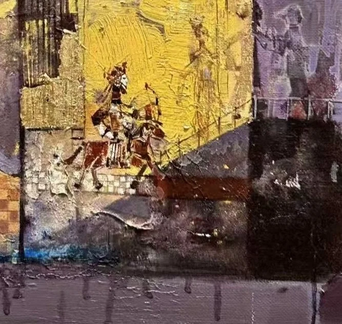 Thematically, the work explores the collision of history and modernity. The ancient warrior navigating a contemporary cityscape reads as a metaphor for cultural memory persisting amid urban decay, or perhaps the solitary journey through collective amnesia. Influences echo both Chinese ink-painting traditions (calligraphic energy, atmospheric space) and Western neo-expressionism (raw texture, drips reminiscent of Basquiat or Kiefer). Technically accomplished and emotionally resonant, the painting demonstrates confident command of color harmony and mixed-media effects within oil.