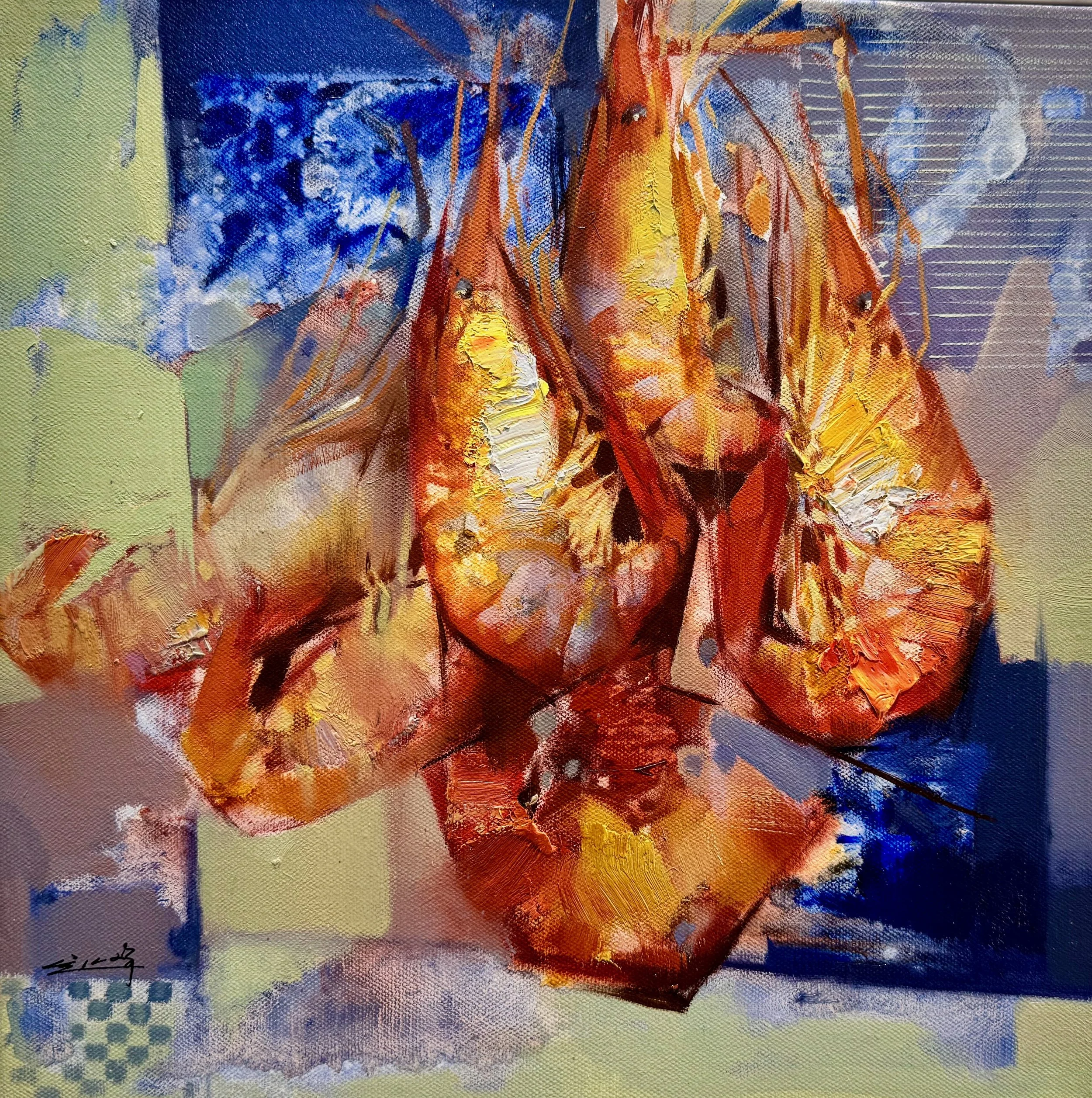Yanqun explores the vibrant fragility of prawns under the theme “The Crimson Call of Sustenance.” This work depicts a dramatic cluster hanging precariously by thin threads against deep blue and white geometric planes, while the other shows the prawns huddled in an intimate, tender tangle — evoking both affection and inevitable separation.