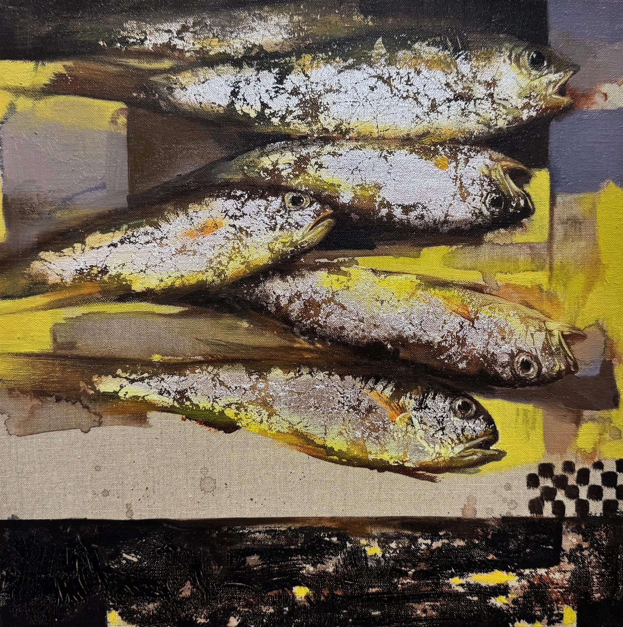 Set against a dramatic backdrop of deep black, earthy brown, and luminous yellow, the tightly stacked composition generates rhythmic tension and quiet urgency. The title The Fish Can’t Say invites reflection on voicelessness, ephemerality, and the fragile boundary between abundance and decay.