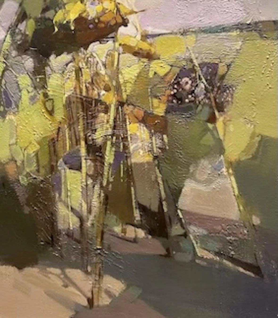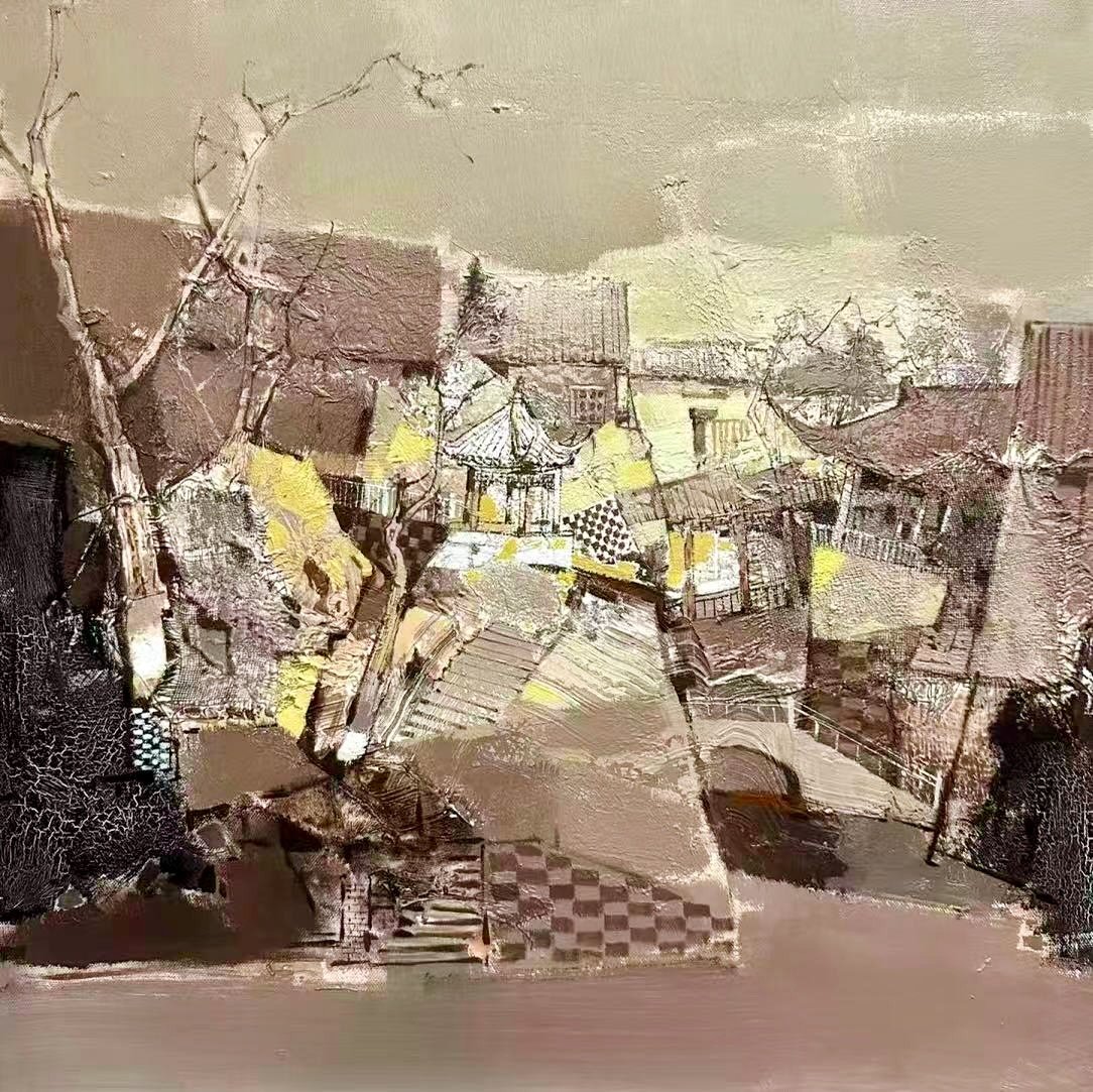 Departing from the muted, melancholic tones of his Jiangnan water-town series, this piece explores heightened color, luminous warmth, and dynamic movement. The thick, textured surface and fractured composition convey the fleeting brilliance and joyful vitality of sunflowers in strong sunlight, transforming a simple floral subject into an expressive celebration of light and transience.