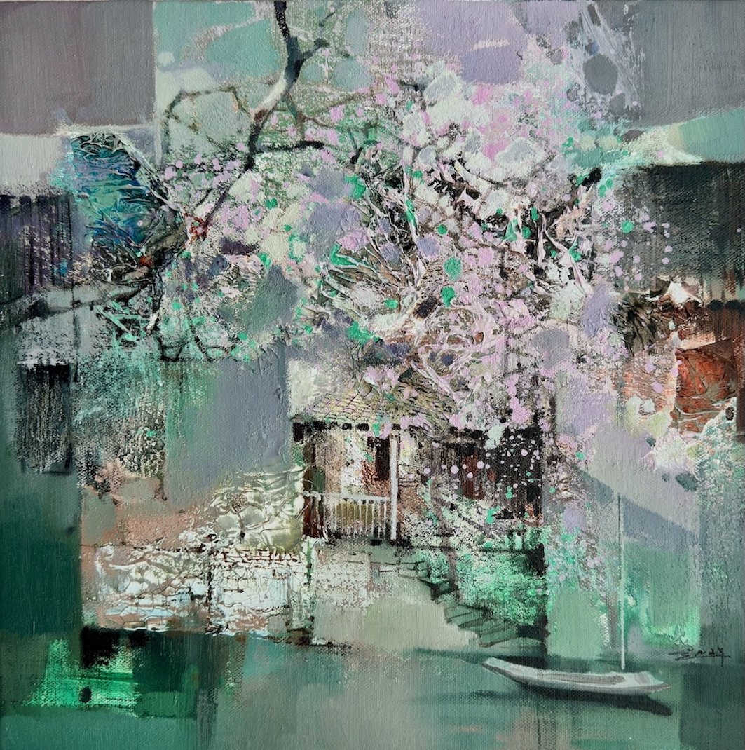 Yanqun masterfully fuses representational elements with expressive abstraction. The dissolving edges and fragmented planes evoke the ephemeral beauty of spring and the gentle passage of time, turning the familiar waterside motif into a lyrical meditation on transience and cultural nostalgia. Technically exquisite with sophisticated material handling and atmospheric sensitivity, this intimate painting radiates quiet elegance and emotional depth. It stands as a refined and highly accomplished work in contemporary Chinese oil painting.