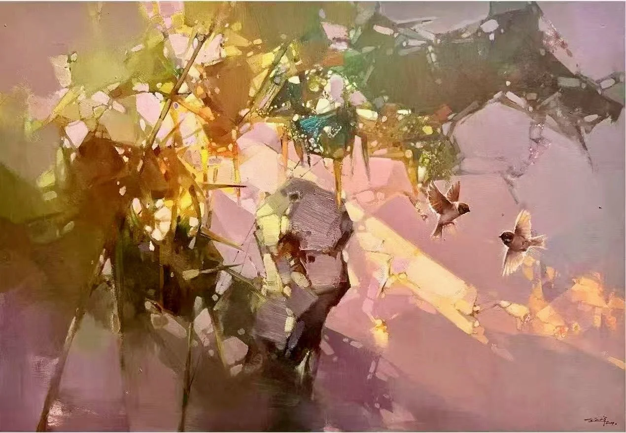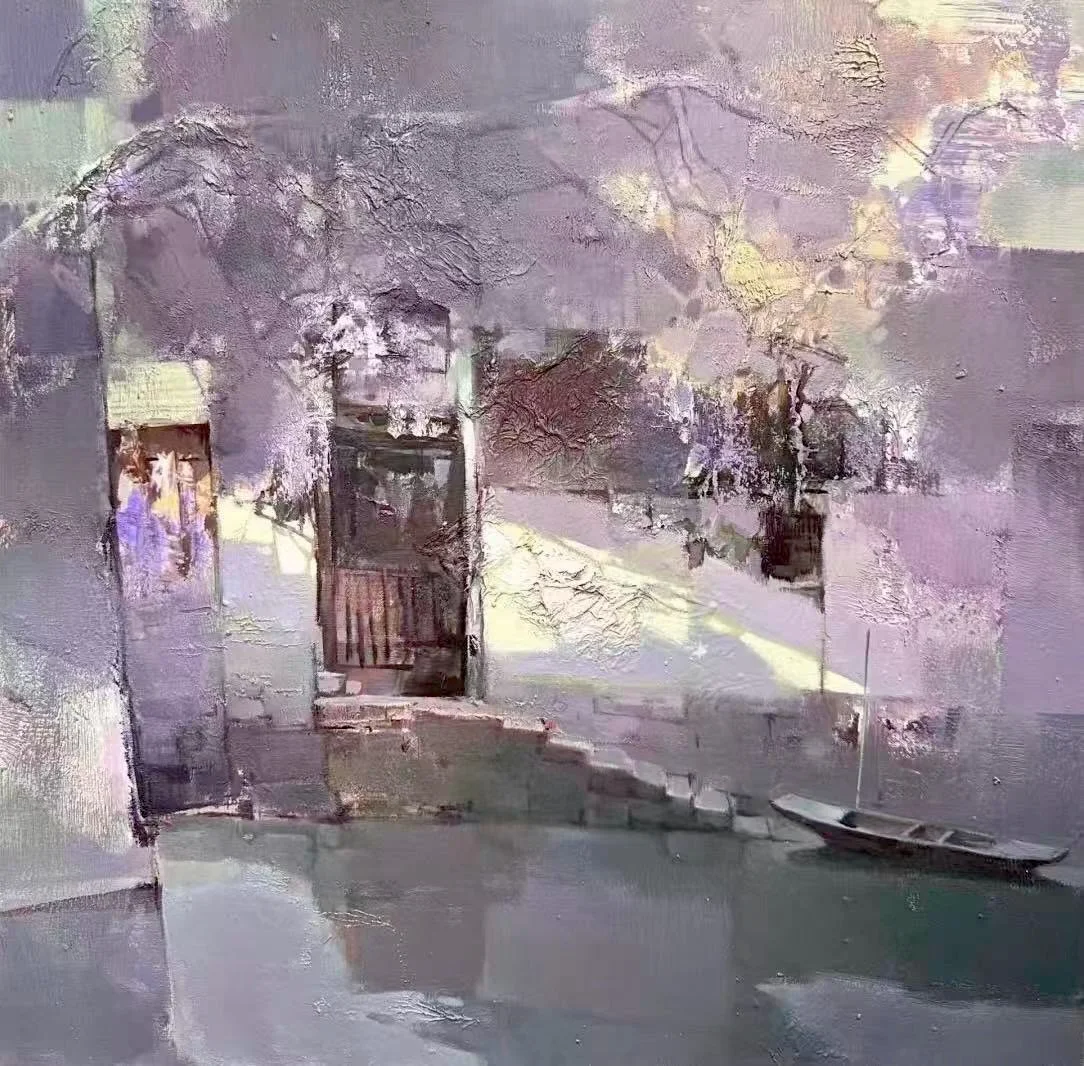 The fragmented forms and dissolving edges transform a classical waterside motif into a meditation on memory, transience, and fleeting beauty. The delicate purple-pink accents and soft lighting infuse the work with quiet romanticism and cultural nostalgia. Technically refined with masterful textural control and atmospheric sensitivity, this intimate painting exemplifies Yanqun’s ability to blend expressive oil materiality with traditional Chinese poetic spirit. It is a delicate, emotionally resonant gem of contemporary Chinese landscape art.