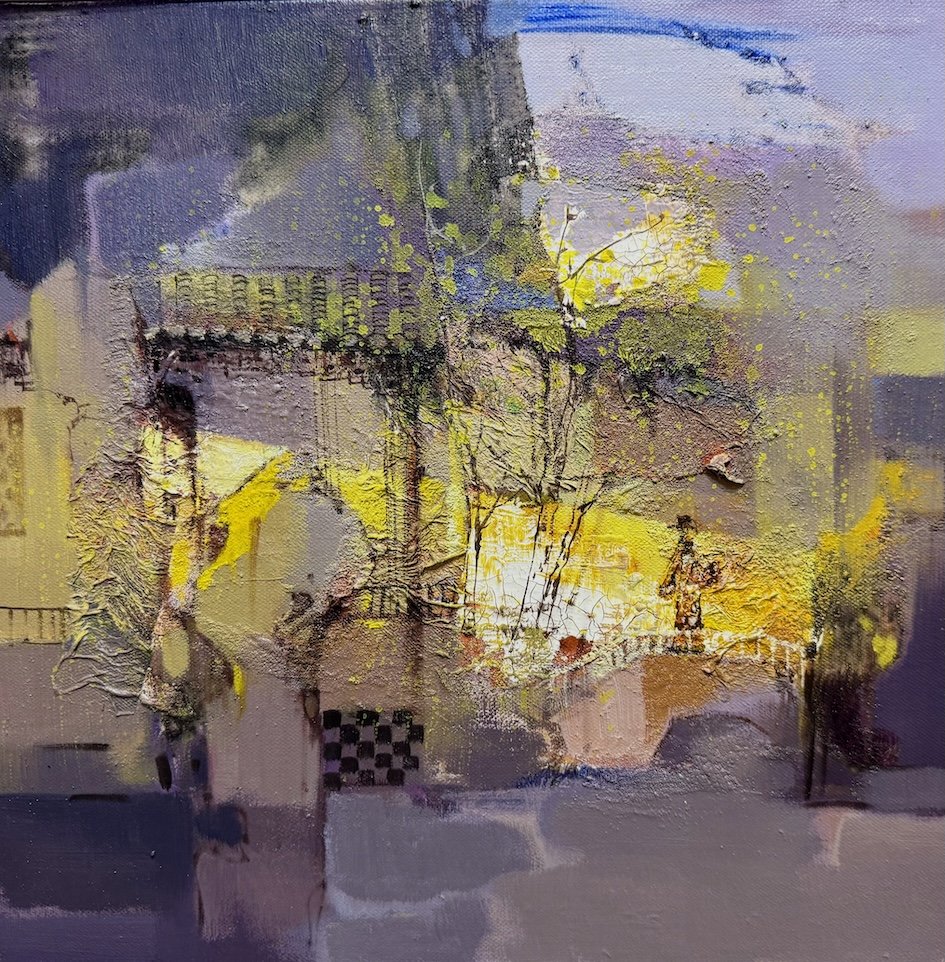 The composition masterfully balances abstraction and representation. Cool purples and deep violets dominate the foreground and sky, while luminous yellow-gold accents create a glowing focal point, evoking the magical transition between day and night. Fragmented forms and dissolving edges heighten the sense of memory and impermanence. With confident brushwork, sophisticated color harmony, and exceptional textural control, this intimate painting demonstrates Yanqun’s refined ability to infuse traditional Chinese poetic atmosphere with contemporary oil techniques. It is a luminous, emotionally resonant work of high artistic quality.