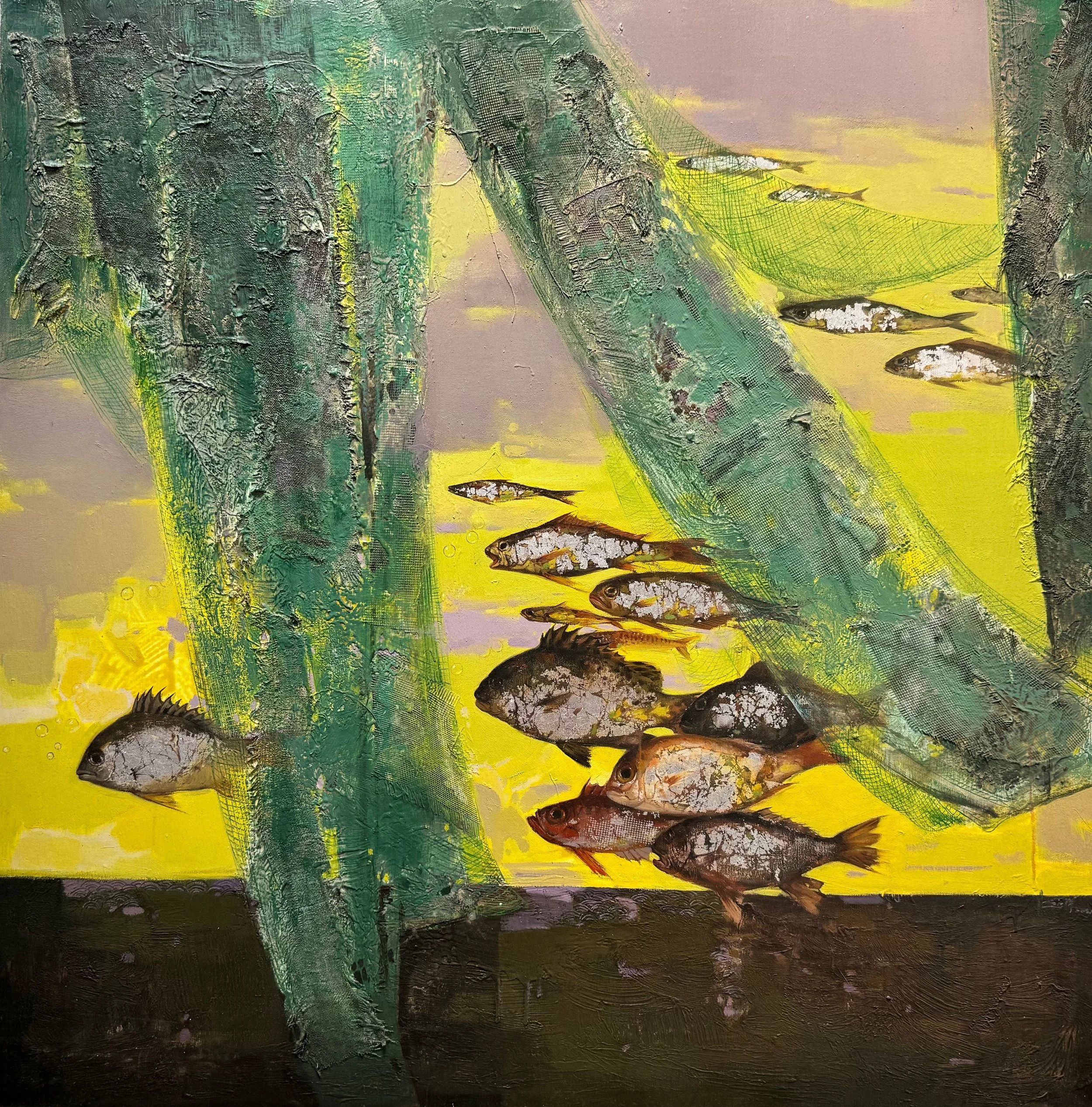 This painting presents a deceptively simple yet psychologically charged scene: a large green fishing net suspended against a glowing yellow field, with a school of fish swimming through — or entangled within — its mesh. At first glance, it appears to be a straightforward depiction of fishing. But when viewed through the lens of cross-cultural social psychology, particularly Morris and Peng’s (1994) seminal “fish experiment,” the work becomes a profound visual metaphor for how different cultures explain social behavior.